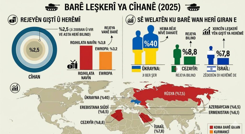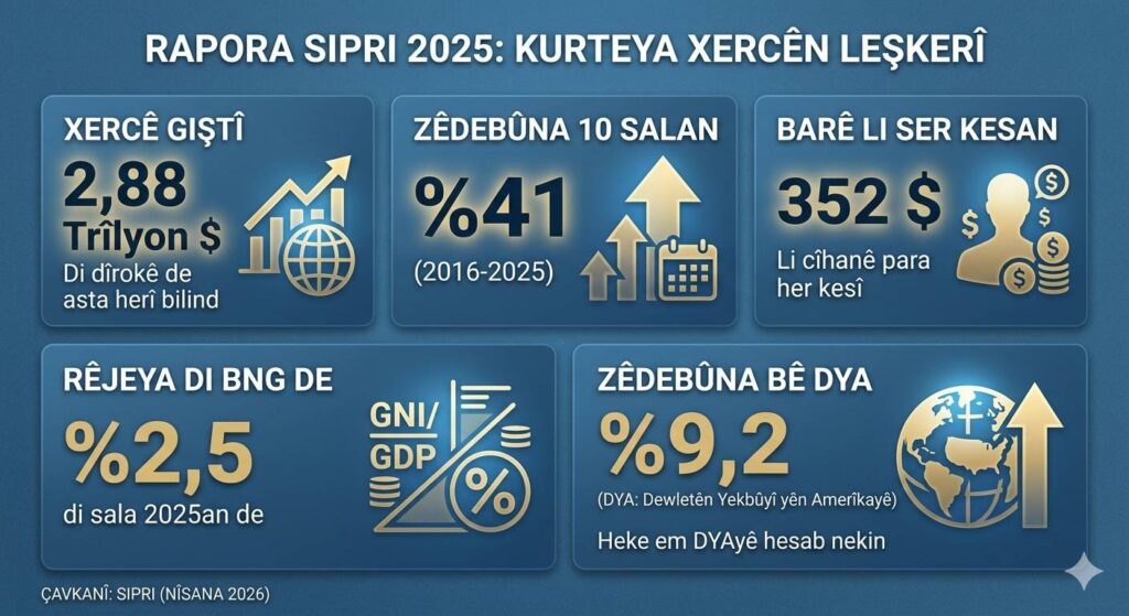 Li gorî rapora SIPRIyê ya Nîsana 2026an; xercên leşkerî yên cîhanê di 10 salên dawî de (2016-2025) ji sedî 41 zêde bûn. Rêjeya xercên leşkerî di nav dahata cîhanê de, di sala 2024an de ji sedî 2,4 bû, lê di 2025an de derket ji sedî 2,5an. Li cîhanê li serê her kesî 352 dolar xercê leşkerî dikeve.