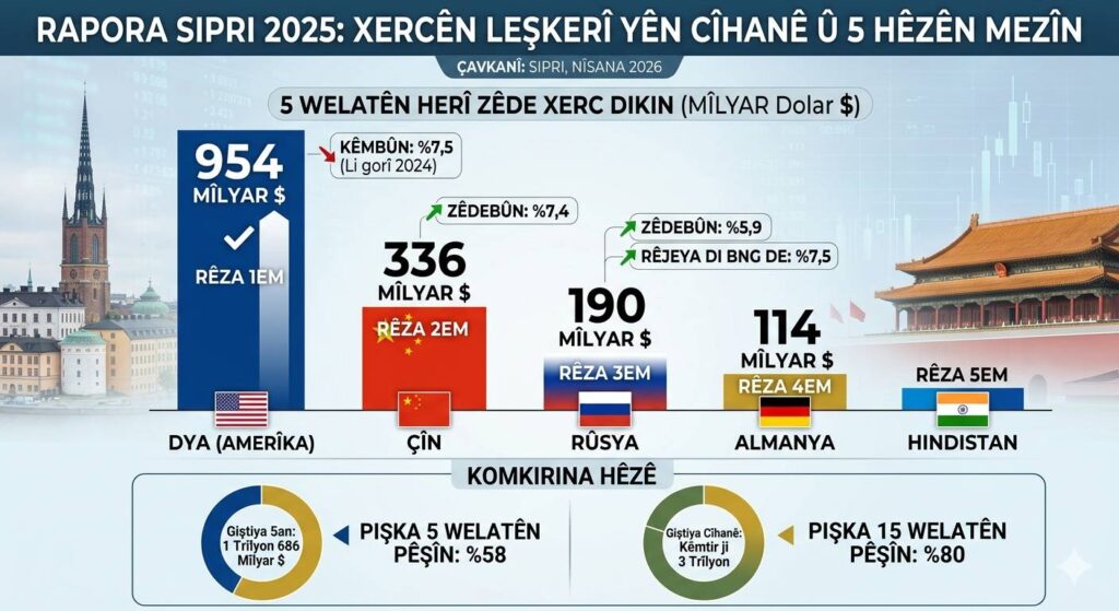 DYA, bi lêçûneke 954 milyar dolarî cihê xwe yê di rêza yekem de parast, lê lêçûnên wê li gorî sala 2024an ji sedî 7,5 kêm bûn. Lêçûnên leşkerî yên Çînê bi rêjeya ji sedî 7,4 zêde bûn û bi texmînî gihiştin 336 milyar dolarî. Lêçûnên Rûsyayê jî ji sedî 5,9 zêde bûn û gihiştin 190 milyar dolarî; ev jî dibe ji sedî 7,5ê Berhema Navxweyî ya Gelemperî (BNG) ya Rûsyayê.