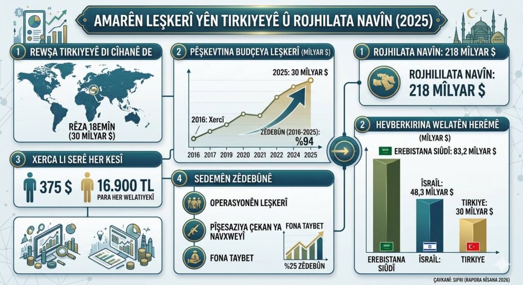 Di raporê de Tirkiye, di bin sernavê ‘Rojhilata Navîn’ de hat nirxandin. Li gorî SIPRIyê, lêçûnên leşkerî yên li Rojhilata Navîn di sala 2025an de bi texmînî gihiştine 218 milyar dolarî. Her çend rêjeya herêmî li gorî sala 2024an tenê ji sedî 0,1 zêde bûbe jî, di navbera salên 2016 û 2025an de ji sedî 36 bilind bûye. Welatê ku li herêmê herî zêde lêçûnên leşkerî kiriye bi 83,2 milyar dolarî Erebistana Siûdî ye û Îsraîl jî bi 48,3 milyar dolarî li pey wê tê.