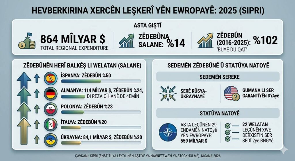 Ev, asta herî bilind e ku SIPRIyê heta niha ji bo Ewropayê tomar kiriye. Xercên li vê herêmê di navbera salên 2016 û 2025an de bûne du qat; rêjeya zêdebûnê wekî ji sedî 102 hat hesabkirin.